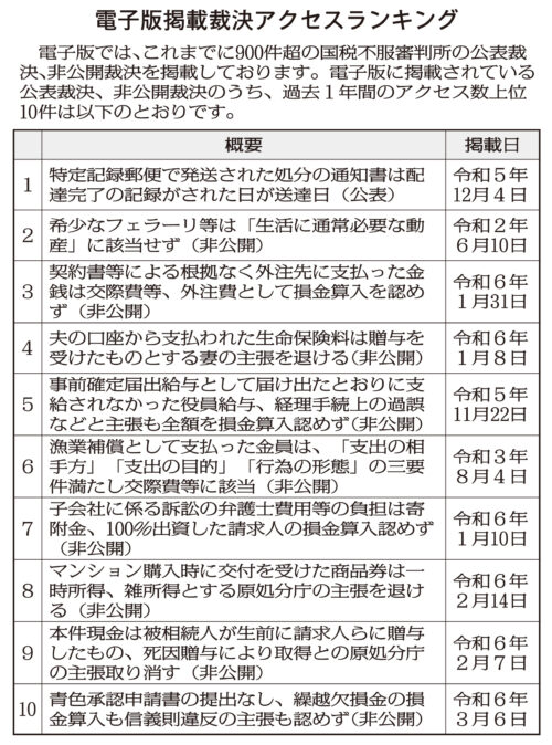 電子版独自の記事を配信します。「速報ニュース」や「判決速報」では、本紙よりも早く、重要な情報や注目の判決の記事をお届けします。「調査事例」では、当局の法人税や所得税、相続税などにおける調査事例を配信しており、一部の調査事例では、事例を分かりやすく図解で示した“ポンチ絵”を掲載しています。また、本紙に掲載されていない「非公開裁決(本紙未掲載)」と「査察事件の告発事案」も配信しています。